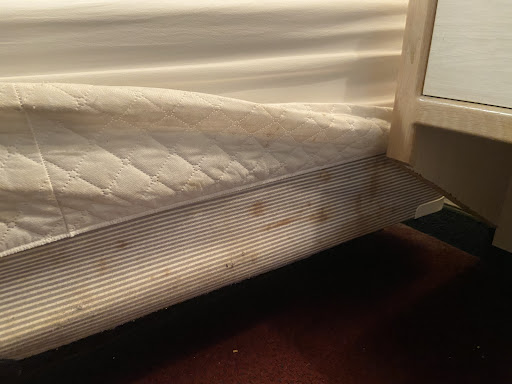 Room number two had a moldy shower curtain and not-as-dirty looking tub, but a clean toilet. The mirror was equally spotted and foggy. The bed sheets were green in this room. The pillow cases looked excessively worn/dirty and the pillows inside were flat and... Fuzzy? Maybe covered with an inner liner? There was a mysterious pinkish red substance- candle wax? Candy? Soda? On the night stand, which drew our attention to a bug crawling on the bed. We left, informing the front desk clerk we were not staying and he told us he would...