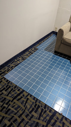 The door at the far end of the hotel (opposite the lobby) was marked as exit only making people at the end of the hotel use the front or mid entrance instead. None of the entrances were secure. The downstairs hall smelled of food while the upstairs hall smelled strongly of marijuana. The one room smelled of cigarette smoke even though it was marked as a non smoking. The king suite was nothing to write home about and had a couch sitting in an odd corner on two pieces of lineolium that weren't attached to the ground at all, just laid down over the carpet (see photo).