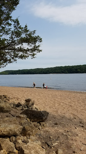 Park has access to a beach on the river near the boat ramp. Water is relatively shallow for the little ones but deep enough for a good swim in the river. Lots of boats on the river over holiday weekends.