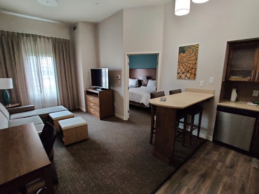 This was my first experience at an extended stay hotel, and I was definitely not disappointed!! I was in Denton, TX for a week of training with my job, and picked the StayBridge Suites hotel since it was only a few minutes from the office building and on theyâre website stated they had full-size refrigerators. Since I was going to be there for the week, figured I would definitely need somewhere to keep the food Iâd be buying during my stay. Little did I know my experience would be so much more than that!! STAFF: I didnât interact with too many staff members, but the front desk manager and woman that cooked/set up the social hour food were friendly. SOCIAL HOUR: During the week Mon-Wed from 5:30pm-7:30pm you can enjoy 2 alcoholic beverages (beer or wine), sodas and juices, plus a small dinner. This was an extremely welcome surprise for me since I had planned on needing to eat out every night, but instead was able to enjoy a relaxing meal in the hotel. One night was chicken noodle & broccoli cheddar soups with a side salad, one night was pepperoni pizza and side salad, and the third night was baked potatoes with different toppings (shredded bbq chicken, butter, sour cream, etc.) and yep, a side salad. Each time the woman who cooked/prepared the food (Christina, I think) told me to take extras to eat for lunch the next day, they didnât want a lot to go to waste. Needless to say I didnât mind!! Having breakfast, lunch and dinner provided by the hotel for a few days was a fantastic treat to me and my debit card! BREAKFAST: The morning breakfast variety had plenty of options to choose from: scrambled eggs, cheese omelettes, oatmeal, cold cereals, fruit, muffins, bread, yogurt, hard-boiled eggs, waffles, coffee, tea, juice & soda. Those were pretty much constant each morning and then theyâd rotate between pork sausage & turkey sausage links, bacon and some days there were diced potatoes. Definitely something for everyone. Plus on the weekends the breakfast lasted until 10:30am, which is longer than any other hotel Iâve ever stayed. You could choose to sleep in a little and still enjoy a nice breakfast before check out. AMENITIES: They have a fitness area, laundry room, business area, pool, outside grilling stations and a large outdoor seating area where you could relax and sit by a fire. SUITE: The room was fantastic! I loved that I had my own kitchen, complete with full-size refrigerator & freezer (with ice maker), dishwasher, coffee maker (with packets to make tea or coffee), toaster, microwave, 2-burner stove top, salt & pepper, and cream & sugar. There were cupboards of pots, pans and dishes, silverware, towels, dish soap, dishwasher tablets and more that I could use. The seating area was a nice space to relax and eat some dinner while watching tv or a movie on my laptop. Bedroom area was pretty typical for a nice hotel â queen bed with lots of pillows!!! There was a large closet I could hang all my clothes in for the week, with tons of room to spare, and a full-size ironing board. Bathroom had a separate vanity/sink away from the toilet & shower, and the vanity had lighting all the way around the mirror (which made it nice and bright when getting ready every morning). LOCATION: Across the street from a mall and tons of restaurants to choose from. OVERALL IMPRESSION: My overall impression of this StayBridge Suites location was wonderful and above expectations from other hotels Iâve stayed at!! Maybe my experience was typical and simply the difference between a regular hotel and an extended stay hotel⌠I donât know, but I definitely enjoyed my weeklong stay and would absolutely recommend this hotel...