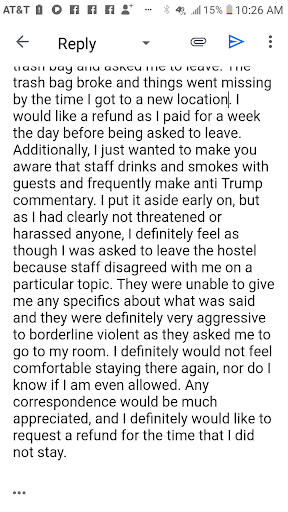 Being that I could no longer afford to stay there, I reserved a room with this hostel. As I was checking in (which I patiently waited to do for 30 minutes by the way) I mistakenly thought the hostel would be another safe space to share my experience, as they had asked me how I was doingâŠ