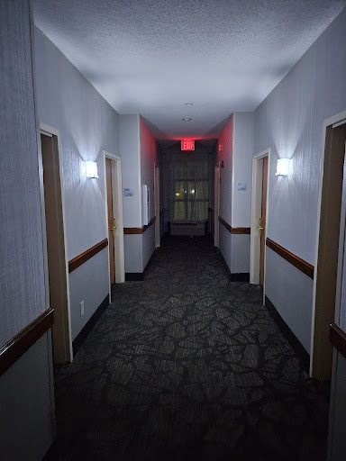 This hotel was pretty nice. I had to evacuate because of the hurricane. It was past 9 PM when I finally got to the hotel. My brother had accidentally booked me a hotel room for the wrong date, but the employee at the front desk was able to switch the date and only charge me 8 more dollars, which was actually a deal because the price would have been more expensive if I had booked a room for that day's price. The luggage cart had wheels that would annoyingly stick, but I was able to fit all of my stuff onto the cart. I loved the lighting, which I never would have thought I would care about, but the blue hue and the soft lighting made me feel relaxed and calm after a stressful day of driving away from the hurricane. It almost made the hotel feel like a big sleep over, if that makes sense? The photo I took doesn't do the lighting justice. And I loved how that lighting was not just for night time. My first room was nice, but the bathroom had cracked flooring and rust stains on the bath tub that made me too uncomfortable to shower because my mind kept thinking the stains looked like something else. They switched me to a different room. That room had a broken fridge and hair in the bath tub, but I didn't want to switch rooms again, so I just showered as quickly as I could. The bed was amazingly comfortable, especially after so much stress and driving. I didn't want to get up. I liked how there was a light switch by the bedside table for the doorway light so you could turn it off without needing to get up. The air conditioner was easy to use and felt so nice. I wasn't able to make the wifi work because my phone would keep detecting the wifi network as dangerous even though it was the hotel's own wifi network. The free breakfast was probably the best free hotel breakfast I have ever had. The food was delicious, there was a lot of variety, and there were even some different options for the next day's breakfast. Only one of the two days was there a lot of people eating breakfast, but despite that as well as me going downstairs with only 30 minutes left, there was still plenty of food available. One of the employees at the front desk didn't tell me I had to say if the fridge was working again by a certain time because maintenance would be leaving by then, so I had to make do with no fridge. That was annoying since it meant no cold drinks and no ability to keep leftovers cold. I'm hoping to be given a discount for not having one of the main amenities. Anyway, I would say the hotel was more good than bad and was way, way better than the sketchy motel I was almost going to stay at. The bed, lighting, and free breakfast...