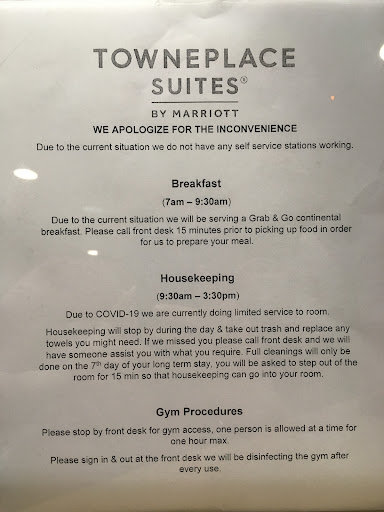 Read moreThis property no longer meets the minimum standards as a Marriott, even as a 2 star hotel. The place is dated and worn, including the beds. Cleanliness and maintenance are wanting. The painting, caulking and other details are poorly done with gaps and mold in wet areas. Some staff were friendly and helpful, while others were not so much. The first morning there was barely any food available for breakfast. No milk, bananas, yogurt, pancake batter, etc. The next 4 mornings some food was available, but not enough and they quickly ran out of many things. The coffee is terrible, even in the rooms. The breakfast room is too small for the number of guests. There is only a single two slice toaster. We went to the store and got what we needed rather than face the unknown and deal with a crowded room. The beautiful palm fronds in front of the buildings whacked the windows at night when the wind blew, keeping people up at night. As a result, people were tired and cranky so we didn’t get to do anywhere as much as we planned. The elevator in our building went down on Sunday and the management apparently chose not to have it serviced until Monday. For those guests on the upper floors with physical challenges, it was an issue; especially dealing with luggage. The signs advising the elevator was out of service on the upper 3 floors remained until Monday night, so some folks ended up using the stairs. The last night a cockroach appeared on the wall in my son’s 4th floor room, which resulted in more lost sleep. They woke up to a dead cockroach on the carpet. The dumpster was overflowing too, so this place is a vermin magnet. The BBQ area has grease on the furniture and concrete, and needs a thorough cleaning. The BBQ area is the only outside seating after the pool closes, other than a table and chairs in the far back corner by the overflowing dumpster. This was the first experience in an American hotel for my son's family just arriving from Peru, and they were very disappointed. In addition, there were no visible vermin control measures, such as traps on the exterior or the buildings. The only security cameras were in the lobby; none were noted on the exterior or the buildings or the interior public areas or elevators. The key activations at the entry doors to the buildings were not functioning, even after dark. The interior fire doors on the first floor were propped open, defeating the required self closing mechanism. A number of entry doors had damaged hardware or hardware that was not consistent. There were few receptacles for smokers to put their butts, so butts were scattered about...