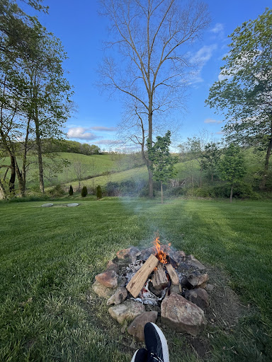 We loved to sit in the rockers on the porch, taking in the view of rolling green hills and enjoying the quiet. It was a bit too cold and rainy in April for us to venture the few feet into the yard to the firepit, but it looked nice. It was not too cold to take advantage of the hot tub (which was given extra privacy tucked into the corner of the porch). The hot tub was nice and clean, and the lights were fun at night.