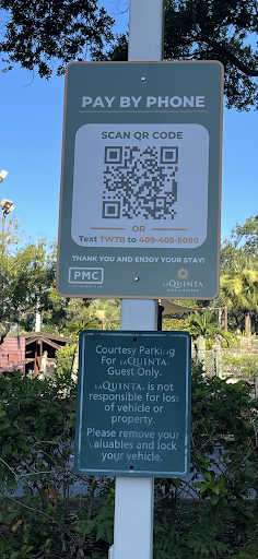 They have two parking signs. One is new that they initially were using to charge non-hotel guests to park, assuming people going to ICON park. It’s a QR code. Now they use it to charge hotel guests to park. Then they have the other sign that says courtesy parking is for hotel guests only. The fact that they have both of these signs up, next to each other, shows they’re clearly trying to be confusing to people and guests.