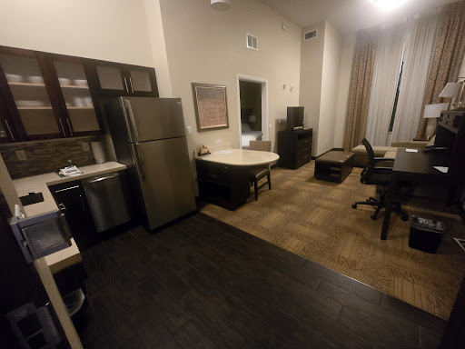 Read moreMy family and I stayed here for just 1 night. Our room was #104 which had a wheelchair accessible role in shower. The suite was large, but outdated. When you enter the room the kitchen is immediately to your left with an open floorplan into what we consider a living room. The kitchen had everything you needed to bring food to cook and appeared clean. There is a full size refrigerator and also a microwave hidden under the dining table that separates the kitchen from the living room. There is also a desk and a pull out sofa. The sofa was a beige color and was stained. I am not sure why hotels continue to put porous furniture in their hotels knowing how filthy they get instead of buying all wipeable items because God knows what substances get left behind. The room is mostly carpeted which is another bad idea for the same reason listed above and tile or laminate would make more sense, but.....who am I. There is also a foot rest and chest of drawers with a tv on top in the living room area.