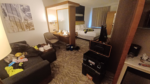 Read moreThis was a one night stay at this Springhill Suites. The reason for the stay was that my wife had an appointment the following morning at the Duke University Medical Center. We had reserved a small suite that offered two Queen sized beds along with a sofa bed. There was a small refrigerator and a microwave in the room along with a small desk top. In our party was myself, my wife and my wifeâs best friend. The room had a separate toilet room with a small corner sink and the lighting was very low wattage. There was another separate room containing a shower and sink top. Both rooms had a barn door for privacy. The overall size of the room was very small even for two people let alone for three. It should be noted that the reservation was for three adults so it is not like I was trying to sneak an additional person into a room designed for two. But it all was good as it served the purpose of providing a place to put our heads down for one night. I canât comment on the breakfast as I didnât take advantage of it being available. The real problem was when we went down on the morning of checking out to get a baggage cart to load our baggage on and check out. Well there was not a baggage cart available. Evidently the hotel has only one baggage cart and it wasnât available. The friend that was with us is the one that went down to get the cart. She asked the desk clerk if there was any others and was told no. The friend returned to the room and told us. We were a bit concerned as it was close to check out time so the same friend went back down to ask the clerk if there was any help available and was told nothing until after 11 AM. The desk clerk was not the least bit helpful and in fact she was irritable, lacked any compassion and frankly is in the wrong business if she canât stand the stress of such a job. She was as unengaged in being a solution to a problem as possible. It isnât as if it was very busy there was one other person in the lobby at the time. I solved the problem by using the desk chair to roll out the heaviest piece of our luggage. The reason this was a problem was that the appointment for my wife was to schedule open heart surgery. I am a disabled veteran that is not able to carry much weight for any distance. So the need for the luggage carrier was real. The hotel should have had more of the luggage carriers it is hard to understand why they didnât. The attitude of the morning desk clerk was...