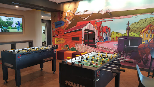The lobby is very bright, colorful, and family friendly. There are: couches, phone charging outlets everywhere, games, cool chairs, free coffee all day, and even a little 'shop' with extra amenities and snacks that you can buy. There is also a patio with tables and chairs off the back of the lobby.