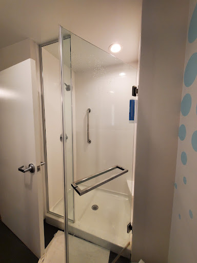 Our room had a King size bed. (Picture is after use, forgot to take one sooner). It is very compact but comfortable and functional. There are wall hooks that came in handy, a little desk, a mini fridge (but no mini freezer section), a mini table over it, a bench, and two night tables. The room has outlets everywhere for charging options. Another nice surprise was that the window has a built in back out curtain you can draw to darken room as well as a white polka dolt one for light and privacy. The bathroom was little but perfect in size with the glass stand up shower. Soaps were provided in tubes mounted in the shower and the side of the sink. It reduces plastic waste and was nice to use our desired amounts.