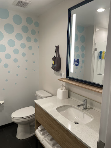 We stayed in a King size one bed room. The room itself was pretty basic as you'd expect from Tru brand hotels. No closet or extra seating but there was a small desk and a bench to set luggage on. There was a mini fridge but not microwave. There wasn't a ton of room to move around the bed, but if you are just using the room to sleep and get ready then that's no biggie. The bathroom was pretty big and the shower was really nice. The soaps and shampoos are attached to the walls in squeezy tubes which I preferred.