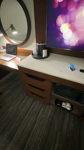 Pros: Room was comfortable and spacious, very easy to maneuver the wheelchair in. This particular room has a roll-in shower, and you get a nice, full strength stream of water (so many other hotels have water-saving devices where the stream is fairly weak). Also, the bathroom has a nightlight. At other hotels, I usually have to leave the bathroom light or entry-way light on so I can find my way to the bathroom in the middle of the night without bumping into anything, but the nightlight in the bathroom cast just enough light for me to see.