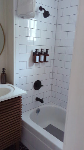 The bathroom was small but efficient. The tub/shower was plenty big and it was nice to even have a window in the bathroom. There was not a lot of counter space but under the sink was a clean and empty cabinet so easy to store whatever. Water pressure was good and the provided shower toiletries smelled great and were lovely to use.