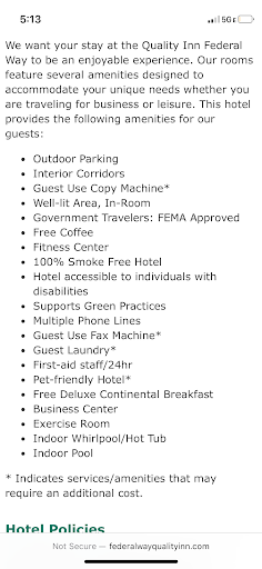 Read moreI did not rate our stay at the Quality Inn in Federal Way lower than 3-star or adequate, primarily due to the cleanliness of the room, which we appreciated. However, several aspects of the experience made it an unpleasant and inconvenient stay overall.