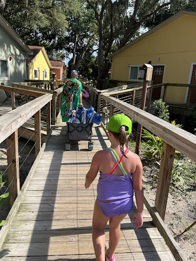 How often can you stay in an enchanting, private space nestled under towering oak trees in which-- if you choose Cottage 3 and a few others--you can lie in bed, open your window, and enjoy a soft breeze washing over your pillow as you gaze at a squirrel scurrying up his tree just so close?! Another bonus is the apartment-sized refrigerator ( but only a microwave--no stove), and a nice, heavy blanket for the winter months. I mention this because so often hotels fail to provide this necessity. The grounds and buildings are well kept, and they've thought of everything for comfort: outdoor shower for your sandy little ones, or your weary, beach combing feet, wagons for hauling on the longish walk to your cottage, and outdoor seating for lovely, quiet times. They even provide a little "book house" where you can take one / give one. If you're an avid reader, bring some of those books accumulating on your shelf to trade. And finally-- the boardwalk. Somehow winding your way under majestic trees while you saunter above ground is just magical... As you walk, take note of the variety of plants, all personally chosen by someone with heart, and a love for nature. One seldom sees all these in one place except at nurseries-- but even they don't have some of the unique specimens. Also, since this is an excellent example of how to design natural landscaping with plants that do well in our sub tropic climate, I wish the plants were labeled so that guests could take that knowledge back with them to enhance their own living spaces. Only one huge caution: the cleaning chemicals are strong and harshly smelly. For the safety and protection of children, pets, and people with allergies this may be a deal breaker. You can call ahead and ask them to clean only with vinegar. Prior to our visit, my friend did request this ( her 3rd time staying there). However, for me, the chemicals were still so strong I sadly had to depart early. Unfortunately, much as I would love to return, it's a no win until they change chemicals, or set aside some cottages which are cleaned solely with safe alternatives: vinegar, Bon Ami (scouring powder without bleach) substitute for Comet, and hydrogen peroxide for disinfecting. The rooms are great, but if you can't stay in them...the reason for...