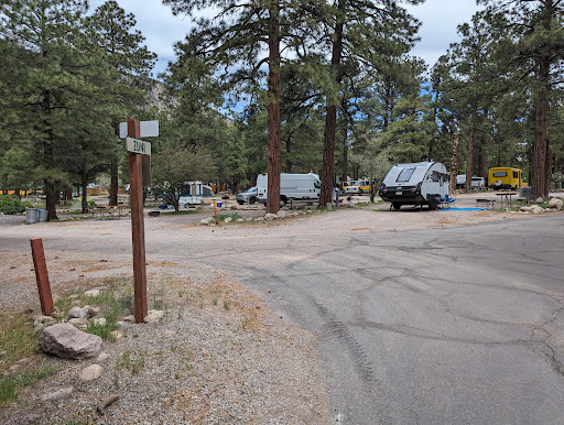The campground is located within a lightly forested area at the base of Elden Mountain. Most of the roads within the campground are one-way roads, marked as such on the campground map but generally not on the roads themselves. Some roads are paved while others are gravel. All of the RV sites have gravel pads, a picnic table, and an elevated charcoal grill. Some sites are equipped with extras such as fire pits, patios, and cable hookups.
