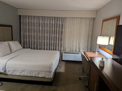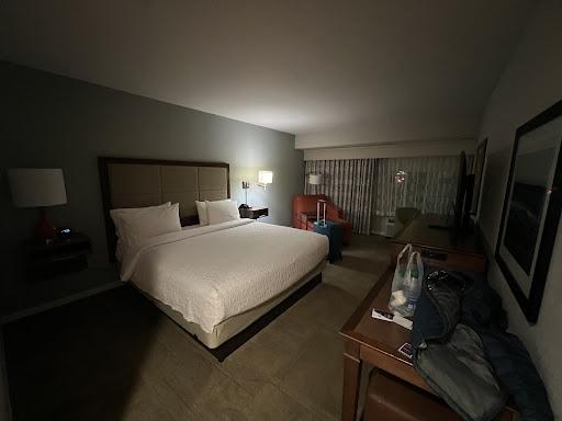 We stayed one night at this Hampton Inn & Suites. I can honestly say we will never stay there again. Upon entering the lobby, the manager on duty Jada was speaking with a staff member and although she looked at me, she never acknowledged me, or said "I will be with you in a moment". When the conversation was over, she still did not greet me. I asked if the room I checked into online was a loud room, and her response was "I don't know I don't stay in no hotel." Well, there is a Home Depot, and shopping center across the street, as well as a convention center, and the traffic was very loud to say the least. The room that I upgraded to had a fireplace - that didn't work. When I asked the manager on duty that evening, she stated that I should speak with the manager on duty in the morning, as she wouldn't be able to do much for me, but the day manager would. The food service people were rude, and almost pushed us out of the way while we were attempting to get breakfast. In all of my stays at Hilton properties, we have never been treated this way. The room needs some attention. The table to sit and eat at has been raised using metal legs, and the chairs (2 for a 4 person room) are so low, that you are unable to sit and eat at the table. There is no luggage rack to place your suitcase on, forcing us to place the suitcase on the floor. The ironing board is not stable, and the pegs for one leg came out and had to be placed back in, however,...