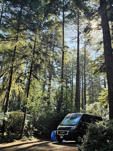 If you really enjoy the sound of leaf blowers for 9 hours a day, this is the place for you! Thankfully the forest is 89% Conifer so there aren't even leaves anywhere, not on the ground, not on the cement, and not even on the trees!! There is also about 8% grass cover in the campground too, but don't worry, they monitor the length of the grass daily and keep it at a nice 1.5 inches, also 8 hours a day. Oh, and if you get here after 6pm, be sure to stop at the stop sign to check in and not the "information" board that proports to go give you the necessary tools to guide you, but only has a sign that shows an unmarked map. If you get confused driving around, that is because the One Way arrows point in both directions on a majority of the intersections, and there are labels such as "A...B Loop," so don't feel alone if you get a bit turned around attempting to navigate the grounds, particularly under the shroud of darkness. If you're wondering if the campsite you're looking at is a Tent site, or a hookup site, just get out and look because there is no indication of such on the site numbers, or the map for that matter. Showers aren't bad though!! No temperature control, but they do get a comfortably hot degree, just right in fact. As good a campground shower as any other run of the mill campground! And the State Parks Ranger was very nice and personable. Volunteers I can't really say other than they very much so enjoy their lawn tools, they seem partial to the extremely loud ones that you can hear on the opposite side of this 180+ site ground! And the raccoons, although downright adorable, are quite acclimated to humans! They will become more and more brave as the evening closes in and the best thing to get them to stay away for me was to flash my umbrella open toward them, that actually seemed the only thing that kept them at bay. But, they're...
