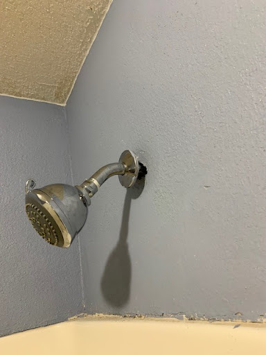 Upon entering the room, the only thing that resembled updates were the bed coverings. They were new and clean. The room had three (3) chairs and all three were so badly stained (see pic below) we placed towels on them prior to use. The show head, tub spout and shower curtain (see pics below) were in need of proper repair/installation.