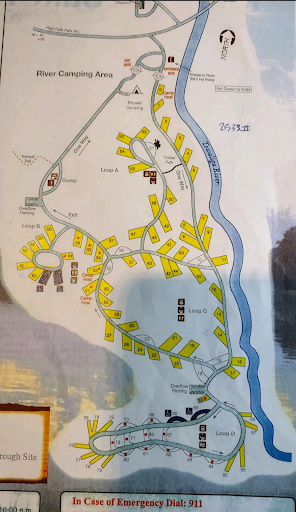 Read moreThis campground is nicely maintained with nice level parking pads. The camp hosts are friendly & helpful. Very pretty wooded campsites. There's no access to the water in the camp area. When we arrived at the camp check in area, we could see part of the falls (see park map), but didn't really get a chance to enjoy it. Best advice: if you do not have some mode of transportation while parked at a site, you must be able to hike fairly long distances to enjoy the whole park. Unfortunately we are older and didn't have any transportation to see the rest of the park. The most we could handle was a short hike to barely see the river (see pic). We were in pull through site #51. Thinking it would be a nice view of water, based on the site map (see pic), but it was all trees. Even if you walk down closer to the water, there's very little to see and too steep to try...