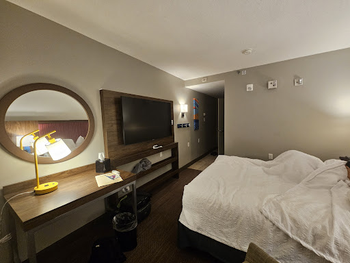 I was with a group this weekend of several dozen parents with kids who booked this hotel (not by choice) for a volleyball tournament at the convention center. One mom awoke this morning (Jan. 23, 2022) and took suitcases out to her car around 5:45. A half hour later she went back out again and found her rear window broken and all of her things gone through. Her car was not alone. In all there were 6 vehicles with rear windows busted out and things stolen. 4 of the cars were people in our group! (Scroll and you will find more reviews that say the same thing happened to them!)