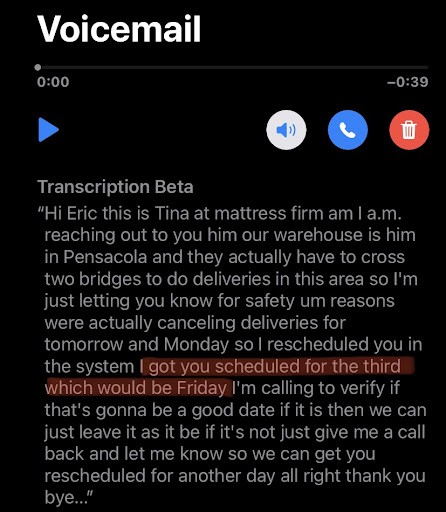 Read moreWe purchased our mattress set in June and are still waiting for our set to be delivered. We got notified that after 3 months of waiting, the mattress finally made it to the local warehouse. Since that notification our delivery has been rescheduled twice now (once due to safety concerns from a hurricane which I completely understand) I got a voicemail from Tina saying I was rescheduled for today, Friday September 3rd, we called a few days prior to verify delivery and we were told that we are good for delivery on the third. I called the store today because I never received a delivery window the night before and I was told that the delivery is actually scheduled for the 10th of September now. I received no call or any information about why we were rescheduled again.