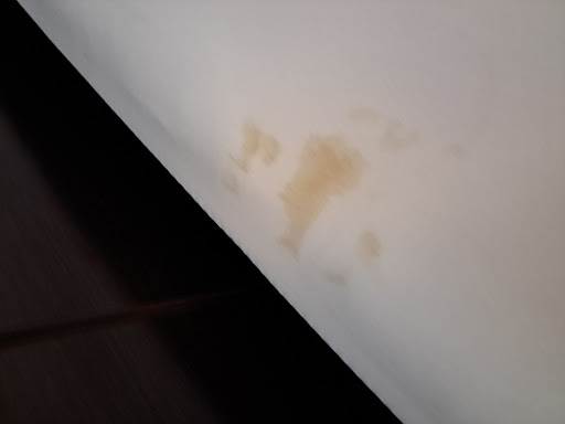 These are some of the pics of the hotel room they put us in. Dirty hand prints near shower wall, hair in shower, multiple cigarette burns on the comforter, water damage and possible mold on the wall and a nasty stain on the fitted sheet.