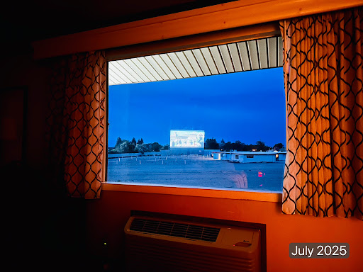 When I first entered the room there was a fairly strong odor which I couldn't identify. After being in the room for a while I didn't notice it. But if I left and came back later in the day I'd still notice something when entering, but not as strongly. I'm not sure if the odor was disappearing or I was just getting used to it. Other than the first time entering the room, it didn't bother me. I've had similar experiences in some other motels. The TV was placed in an odd position in the room relative to the bed which would seem to make it difficult to watch from the bed. I don't watch TV on trips, so it didn't bother me. Some parts of the floor seemed over creaky when walking I wasn't there for the drive-in movie experience, but I briefly checked out what it was like from my room. From my particular room I was unable to see either screen from bed, so I had to sit in front of the window using one of the table chairs. The screen is far enough away that it is pretty small and not a very high quality image. Seems to me kind of like an idea that once had it's place, before we could stream movies on our TV's, computers, and tablets. These days, not so sure. Your experience may vary.