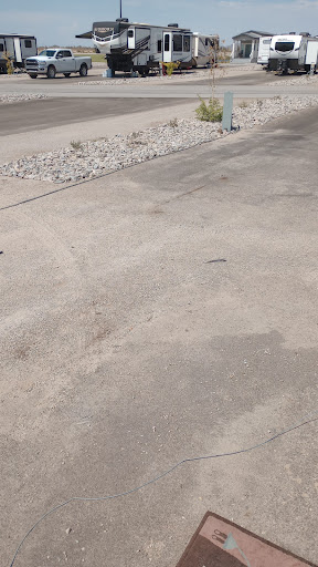 This big-rig friendly campground has 265 pull-through and back-in RV sites, along with 8 cabins. All of the roads are chipseal (think asphalt under a thin layer of tiny gravel) and fairly wide. The sites have wide asphalt pads (probably 25 feet; didn't measure) allowing you to park alongside your rig, and are separated by either gravel or large rocks. The hookups are all located around the middle of the site. There are currently no shade trees, though many sites had saplings planted in between them.