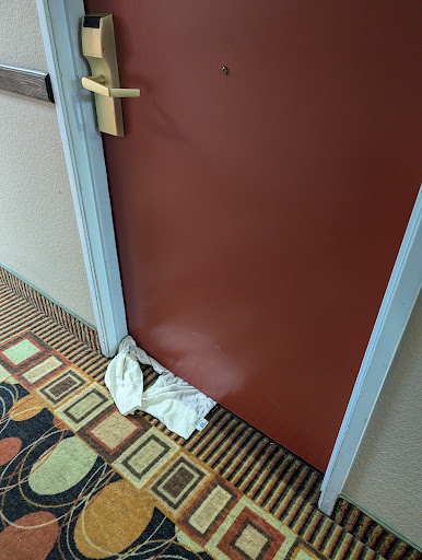 Read moreYou get what you pay for. This was the cheapest hotel we could find at such short notice. Checking in was a breeze, they let us check in early and the guy was really nice and helpful. It was downhill from there. The elevator was janky and scary at times. Our bathroom had severe water wasn't. The bathroom door was falling apart and held together with nails. We couldn’t close the door at all, which made it awkward to use the bathroom in such a tiny space with the door open. The walls had water damage. The room was no smoking yet there was a burn mark on one of our blankets. The refrigerator didn’t work and the microwave made a ticking sound all night. The AC worked well! The bed was comfy and free of bedbugs so that was nice. Don’t rely on the Wi-Fi. It was real touch and go. In the morning the breakfast was bleak. The juices were flavored water. The coffee and “hot water” were room temperature. They had cereal, no milk. No fruit. They did have some white bread, don’t know what they want you to do with that as I didn’t see a toaster and there wasn’t any jelly nor butter. They did have waffles. Again no butter or syrup either. So we had room temperature (can’t call it hot) chocolate for breakfast. We ended up going to Stephanie’s Cafe for breakfast and that was so good and close by I highly recommend that. When I went to check out and let them know the bathroom door doesn’t close no one was there. I walked around, called out “hello?” a few times, waited a couple minutes and no one ever showed up so I just left the key cards. This place is a comfy bed at an affordable rate and that’s it. Don’t have high expectations when coming here. I was happy to be leaving after one...