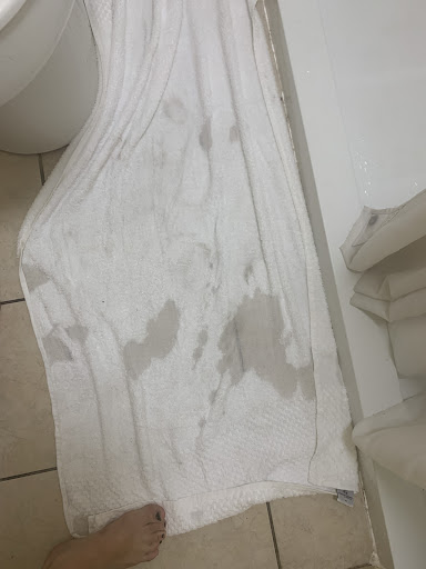 There was a large wad of hair on the floor in the bathroom, in addition to the several roaches that we spotted scurrying around in the bathroom each time we turned the light on. I didn't even take a shower before checking out because it was so gross. There was a piece of baseboard missing from the front of the shower pan which was draped over the clothes hanging area.