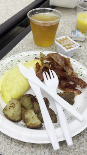 Unfortunately the people above us seemingly never found out how nice the bed was. Starting at 8:30pm it sounded like a gymnastics competition was taking place above us. Huge thuds, running, stomping, and rolling of chairs/luggage back and forth commenced until 2:30am. Around 10:30 I spoke with the front desk to see if there was anything that could be done about the excessive noise. The woman I spoke with said she would "check on it" and that was it. The mirrors and pictures on our walls were shaking from the thuds and stomping/running above us. I was finally able to sleep around 2:30. I had plenty of time to babysit the thermostat at least. In the morning we headed down to breakfast (which is usually one of my favorite parts of a Hampton stay). There was a much smaller selection of items than I am used to. Most things were empty and no one was attempting to refill them. I guess don't count on a full breakfast selection here. I attempted to speak with the front desk about the air conditioning and noise issues from the night before. There was no manager on duty and the woman we spoke with just agreed with me that I did indeed look tired. No apology or attempt to collect any information about the possible maintenance issue with the AC. It's not exactly ideal to have very little sleep before an 8 hour drive home.