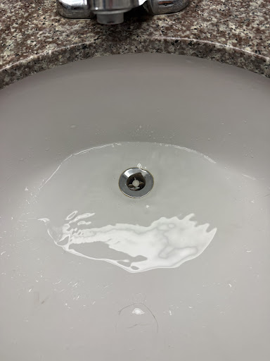 Then we hit the bathroom sink — which had some paper trash shoved in it, clogging the drain. So instead of running water, it just became a lovely little swamp. A real treat.
