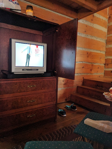 If you're looking for a ritzy, modern, fancy place to stay, look elsewhere. They have an old CRT TV, which we never turned on. We're in a cabin. You're in a cabin, I would have preferred if there was no TV, but I could see where someone else might want one. However, if they put in a large modern flat screen with a modern entertainment center would ruin the aesthetics.