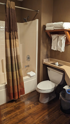 Read moreReturned home after a 2 night stay and we were very happy with our visit and has a nice lodge theme which gives a cozy, homey feel. Our room was very clean including the bathroom - NO out of place gross foreign hairs and no funky smells...and that is not always easy to find...kudos to housekeeping!! We stayed in the king room w/fireplace & whirlpool. The room was a very generous size, more than enough room for us and bags/shopping items...however, TV was a little far from the bed when watching later at night, had to turn volume up a little louder then normal to hear it (while trying to be considerate of any would-be neighbors). Bed was comfortable with plenty of pillows. Only negative in this room was the stand up shower surround...we are average sized people and it was a little tight/narrow to move and turn in that space but was still doable. Nice upgrades...USB charging station, Keurig, good sized mini fridge too. Pool area, pool and hot tub were all clean and all appropriate temperatures. Good variety of breakfast items, different main entree each morning... first day was biscuits and gravy with a flavorful sausage bits...really savory, some restaraunts cant even get this right!! Next morning was sausage egg n cheese sandwiches and french toast....again, both very good. The look of hotel is deceiving from outside as it looks like your 'typical' hotel, but they really did a nice job with the lodge/woodsy decor throughout! We would be happy to return again in the future and...