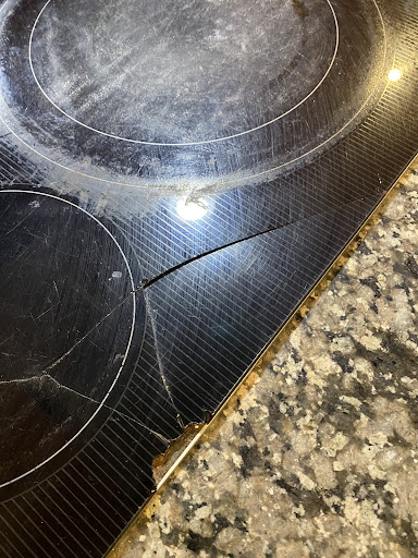 Initial walk in. The door is so dirty and faded that you can see the white or wood on the door. A simple coat of paint could easily fix. When we walked in and did an initial walk through EVERYTHING WAS BROKEN! Light fixtures all throughout the house was broken or not working, the stovetops are cracked and falling apart. They put some type of sealant on them as a temporary fix. But it’s badly damaged. Cabinets and wall decor missing throughout all kitchen areas. Stains all over dining room tables like someone spilled red paint on them.