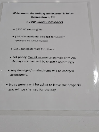Read moreBooked under employee rate on day of arrival looked on the app and no reservation, no cancelation notice nothing.. so I called guy says your card declined so we canceled it.. checked card I'm good there's 200.00 on the card and the room plus tax is 161 and some change and 50.00 for incidental.. checked bank no attempt of a charge.. so I recreate the reservation and call same guys says card declined... so I give another card because it's a 9 hour drive and won be in till 1 am.. guy says I'm good.. we arrive and low and behold it says on the desk reminder incidentals for out of state 150.00 and locals are 250.00.. so that's why it was declined, but nowhere on the site does it state this.. not a biggy paid it. Go to the room, and there's a card for almost every item in that room on what they will charge you .. it was a learning experience, but not one we will repeat. ihg inn and suites has always had across the board 25 to 50 for incidentals and 250 for smoking.. wel, it's a lesson learne. If you go there, know you're going to pay more than it's worth... It's not worth it in my opinion.. breakfast was over cooked it's edible but nothing more.. pantry get everything you need and want at the gas station it's a 300% markup if you get it at the hotel.. when you get to your room check everything and take pictures we stayed in 304 shower curtain had a rip in it and the water gets on the floor. Toilet has flush back so flush it when you stand up otherwise it come up back at you.. outside of those and price it would have been better to stay somewhere else because this isn't worth what they are asking... even at a...