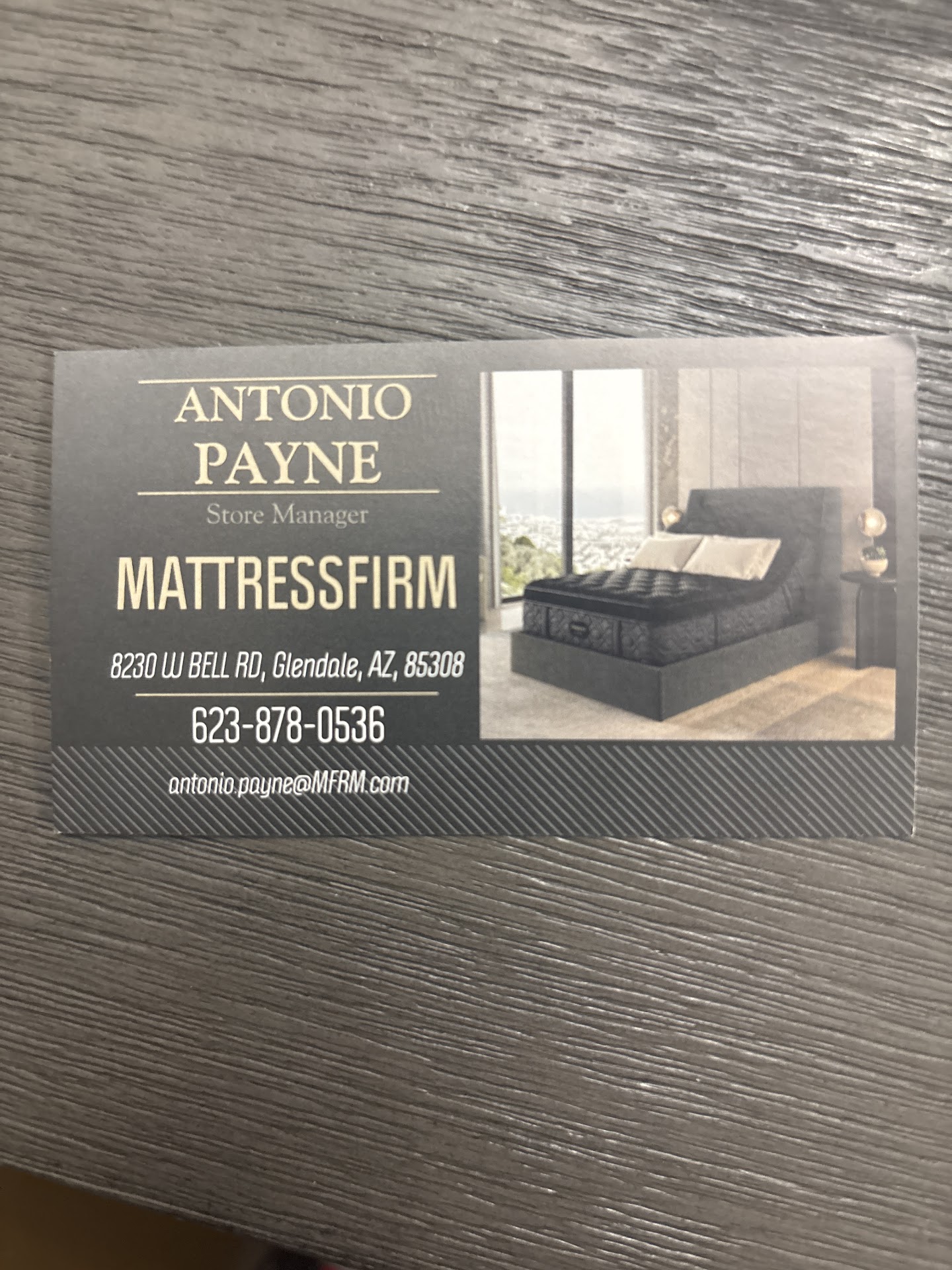 I walked in was professionally greeting by Antonio Payne being in sales myself for 40 years lead me to be intrigued further cuz I just moved here to retire I had no bed or anything in talking with Antonio he went over the options of what I need vs what I wanted I never have bought a bed in my life knowing nothing he was patient and knowledgeable I laid in 6 different beds for an hour beauty rest sterns and foster and temper peptic or so and listening again what feels more comfortable to you no pressure felt anytime walked me through option's of each bed and let Antonio use his experience for me to make a decision whatās more comfortable and to my body type and do the product of elimination my choice not his at that point I was ready to make a decision and move forward I knew I didnāt have to buy anything but with Antonio his professionalism and no pressure I was ready to make a commitment he gained my trust as I did for many years in my profession Iāll be honest I walked in to just window shop to get pricing and options but Antonio was honest he did what ever successful salesperson does just listen to the customer so I decided to pull the plug and make a buy just so you know this was my first contact with Antonio never meet him before and this was my first store I went into because it was close to my residence I had plan to shop around but again with Antonio professionalism and knowledge and non pressure sales process I knew I was done stopping I know Iāll be happy with my decision and choice cuz I picked it not Antonio just a few other benefits you have a 4 month trial basis not happy with your choice get something different and many payment options I know I wrote a lot but important I let others know my experience and maybe someone else can benefit as I did without pressure of buying the most expensive bed I...