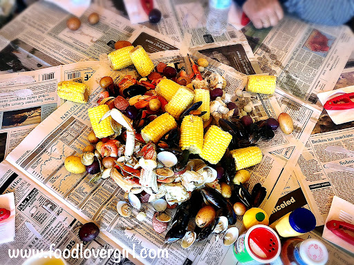 The picnic tables were all set up for us for the feast. Once we were all seated, the pot was brought over to each table and he dumped the pot of seafood gold onto our table.The seafood feast included crab, shrimp, clams, mussels, potatoes, onions, garlic, corn, and sausage. Oh my goodness they were awesome!!! So much crab legs and everything else⦠We all got down and dirty for this delectable feast.
