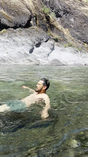 Now the river? Absolutely stunning â clear, cool, and refreshing. Thereâs no sandy beach, but the rocks are smooth. Definitely wear water shoes though â itâs rocky and youâll want that extra grip. Itâs also dog friendly, which was a huge plus for us! Our pup Guapo had a blast swimming and exploring the water.