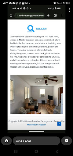 Read moreWe stayed at Hidden Paradise for two nights through the week. Arriving Tuesday afternoon and leaving Thursday morning. We booked site 74 right on the river. Our site was small but very nice. The grass was in good shape and it was fairly level. Luckily the sites to the left and right of us were not booked and I was able to maneuver the travel trailer into place easily. I can imagine that on a busy weekend getting your rig into place on the river sites could be a bit of hassle. The sites are tight and in order to park parallel with the river and have your door facing it you must pull either through the sites next to you or be a hell of driver. We had several trees on our site so we werenât able to use our awning, but the trees offered plenty of shade so it wasnât an issue. Water and electric were very close. I only used one 25ft lol water hose and 30amp electric cord. You share a water supply with the site next to you. So if you book an odd number site on the river be prepared to have a little bit longer run of water hose and electric cord. The campground itâs self is very large and they have several sites, and several seasonal sites. Some of the sites are well spaced out and large while others are a little cramped. The river is very nice. Itâs not a large river and I would classify it more as a large creek. You could easily walk it if you like. I think most people tube down it. It seemed clean and we saw several fish. We utilized the walking trails around the campground and saw some scenic views of rock cliffs and small ponds. The campground has two shower/bathroom houses, both are located right next to each other in the center of the campground. From some of the sites the walk to the bath house could be a tad far. One of the bath houses is older but appeared to be well maintained and clean. The other seemed newer or freshly renovated. It offered private shower rooms with a restroom and sink inside. The showers were very large and spacious and had ice cold a/c. This shower house was also very clean and well maintained. The camp store had everything you could need and then some. The playground was nice and during our stay they were doing updates to it. The quarry was clean and clear. Thereâs no beach area so donât get the idea that youâll be hanging out lake side in your beach chair enjoying a beverage. Itâs all docks and floating obstacles. Perfect for the kids. You do have to pay extra for lake access, but if youâre camping itâs reasonable. They have a newer dump station with dual access in the rear of the campground as well as an older dump station along the exit road. The campground also had decent WiFi that I was able to use to stream movies. This could be due to us being the only occupants at the campground at the time. Iâm assuming performance drops when the campground is full.