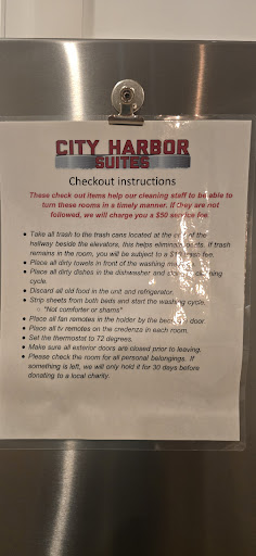 Located in: Guntersville, AL|City Harbor review—room 302|The property was recommended to us by one of our relatives. We have some good and “needs improvement” comments to share.|The good:|1. The property appears to be relatively new and is very clean. |2. Spacious suite with a nice living area, dining table, fairly large kitchen with microwave and dishwasher along with a large refrigerator plus stove/oven, two bedrooms (king in one room and queen in the other), two bathrooms (one with shower and the other with tub/shower), and a balcony area looking directly at Lake Guntersville…which has two chairs and small table on it.|3. Staff members very nice and helpful.|4. There are only 20 suite units, and we did not have any noise other than the band that played down the pier on the weekend (was able to faintly hear it in our room).|5. It is pretty easy to access, is in close proximity to the lake and also to some restaurants, a bar and two grocery stores not too far away.|The needs improvement:|1. The property is set up with a touch pad for entering the room and the code is sent in advance. No checking in at an office. When we arrived, the key pad was badly scratched up and I could not even see the numbers to be able to open the door. We had to make a call to the office to summon a staff member. Due to the problem not being able to be resolved relatively quickly, they were able to move us to the next room for the duration of our stay. Honestly, this should have been addressed and replaced before our arrival. |2. In the first bathroom--- it has a shower, and the property provides dispensers on the wall with body wash, shampoo and conditioner. This is appreciated; however, we prefer to use our own shampoo and bar soap (there is no bar soap provided by the property) and there is no place to put the personal toiletries in the shower except to put them on the floor. We suggest that at least a corner shelving unit be put in the shower for this purpose. It also needs more than one towel rack in the bathroom.|3. The shower in the first bath and the shower/tub in the second one need to have grab bars for those who may slip getting in or out…this is especially true for the one with the tub/shower.|4. In the living area--- the view of the lake is great with the sliding glass doors; however, it really needs to have curtains available to provide some privacy (those coming by with boats can easily see into the suites), block out the morning sun, and also at times to block the light in the middle of the day. This is not only for privacy, but to also be able to see the television as the glare makes it difficult to see the screen. Also, if we wish to take a nap on the sofa, the bright sunlight coming in the large windows makes that difficult as well. The furniture is all an off-white color and it will not likely take long for it to become soiled/stained (sadly, not everyone takes care of furnishings as they should).|5. Would be helpful to have room darkening shades or curtains in the king bedroom. The blinds that are present do help a little, but the blinds are no match for the bright morning sun. I was thankful to have brought my eye blinders to help not be awakened so early by the light from the morning sun.|6. The fitted sheet on the king bed does not remain down on the mattress. I had to keep putting it back on the mattress each morning as the top edge rolled up and I was sleeping partially directly on the mattress.|7. In the king bedroom—there is a cabinet for the television and it has two fairly skinny drawers. This is almost no storage for unloading a suitcase (esp when staying for more than a day or two—and we were there for the week). The room needs drawer space. The closet has hanging space only--- needs to have a shelf in it above the hanging rod for storage.|8. In the queen bedroom—the cabinet for the television has no drawer space at all….just the support stand for the television. Again—drawer space needed and the closet also has no shelf in it above the rod, but a shelf would definitely help.|9. The televisions are all “smart tvs” and have two remotes…one for the tv (on/off and volume and selecting the Direct tv or smart options) then the second remote for the Direct TV. For those of us who are not as smart as the smart tv and trying to figure out the combination of how to use the remotes, it might be a good idea to include some instructions for use of the remotes.|ADVISORIES:|1. The property is a bit on the pricy side, but it does have some good features.|2. There is not a pool at this property. Guests can get into the lake although I did not wish to do this.|3. It is a little distance from the parking area to the rooms. For those who are mobility challenged, there are 6 parking spaces, but they are not that close to the building. If a guest has a scooter, then it’s not an issue. But if they use a rollator or cane, even though the handicapped spaces are present, it is a bit further than most places to get from the spaces to the rooms as the rooms are on floors 2 and 3 (elevators are available).|4. The parking can get a bit limited more on the weekends as the area is pretty popular especially for one of the bars (Levi’s) which also has a band playing outside on Friday and Saturday nights, and also a nice restaurant (Mike’s Steakhouse) on the pier.|5. When guests check out of the suites, you have to strip your bed sheets and put them in the washer before you depart. Used towels—are to be gathered and piled in the floor in front of the washer. You do not have to wait on the sheets to finish—just get them started. Guests also have to take the trash out to the can at the end of the hallway. The property does not charge a cleaning fee as some condo-type rental units do, but they do ask for the sheets, towels and the trash to be handled as described.|FOOD OPTIONS IN THE AREA:|1. Big Mike’s Steakhouse—is just down the pier from City Harbor suites, so it is only a 