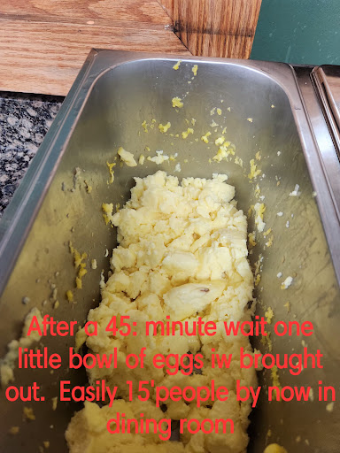 15 minutes later a staff member did bring out a very small bowl of eggs. A few minutes later a small bowl of potatoes. Fresh fruit was not replenished. Bread was not replenished. An extended family who had been waiting 45 minutes like us finally gave up and left. There clearly wasnât enough eggs or potatoes for their family.