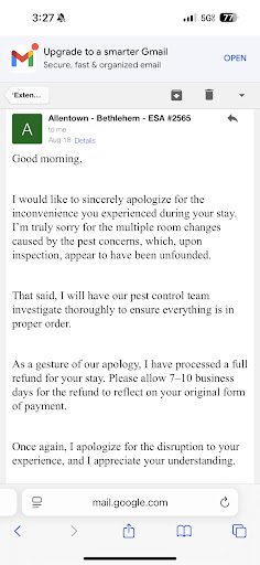 Read moreStayed at this hotel before in transition time in my life and no issues with my studio. Needed to come back as other location in Somerset NJ was beyond awful. Front desk this time here put me in room with all brand new furnishings on the first floor in the back. The studio was beautiful but there was a major problem. I was put in a room that had ROACHES and was told by that front desk person to go to Weis and buy spray and also put cinnamon around the room This was totally unacceptable and I got moved the following morning to a room on upper floor with no issues. for the rest of my stay. I want my refund for the first night as it was awful and still need that put back in my account!!!!!!. I also see that on September 1 someone else put a review saying ROACHES too. WTH is not the board of health coming in to STOP the issue or are these rooms still being rented knowing perfectly well what is inside these rooms when giving to new guests? Sorry but I need my money back for the first night and was severely traumatized for what happened in that room on the first floor. Word of advice. Know u r a business and all but renting out rooms knowing this problem hasn't been fixed YOU should not put guests in these rooms until these problems are rectified immediately and again I want my money back for the first night with being severely traumatized sharing what could have been a great stay with brand new furnishings but sharing the studio with ROACHES and being told to buy bug spray and cinnamon at a local Weis at night time. Sorry but I can't give a perfect review on the first room at all and I am not going to lie!!!! Second room ok on2nd floor but guy next to me put up white gate across hall to let his cats run around hall way to get their exercise these r true accounts of extended stay in Allentown...