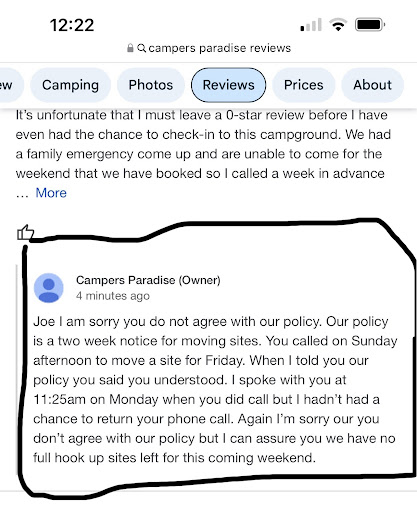 First off when calling to make sure we could put a tent on our rv site they told us they would have to charge us for a rustic site for the weekend $99 for 3 nights. So on-top of the $249 we had to pay $99 more for a tent on the same site. Ok so we paid it. i asked A few people& they said they did not have to pay extra! not cool! Woke up on the first morning here&there was a flow of water coming from the ground. It had a bad smell to it & it was heading toward our site area. We had the ground manager come over &he told us "it was not sewage but it did smell bad". He did come back and offer us 2 sites (rem we had to pay for a rustic camp site for our tent) up closer to the playgrounds. This area was literally 20 feet from the pavilion, the giant campfire, bathrooms, volleyball court &playground &our neighbors would literally be in the back of our picnic table. NO space!!! So we choose to stay in our current spot. They did offer $25 off a day. later that day the water was getting worse, it is gray in color! This is not just ground water! Its some kind of water runoff from sewage somewhere. we stopped a staff member & he came over and told us they knew about this They dug it up& just filled it back in. Seriously!? Oh its site 75 STAY AWAY! So we sent that staffer to get the manager about 530 (mind you he was supposed to stop by at 300 also). Anyways the mgr never came over. We just went to wash dishes& there the mgr & staffer were playing corn hole & drinking!! We have heard from multiple campers here that this place changed ownership in 2021 &they said it has gone down hill! They said just this year the prices have about doubled for permanent rental sites& alot of people are moving out at the end of this season! This should be a huge sign to people coming here the "regulars" are leaving Day 2 I went to the rest room at 3am & the toilet would not flush& i couldnt wash my hands, no notes in the bathroom about water issues. Woke up this morning & was i formed that the sewage was worse & came closer to my tent. I popped out of the tent & it is flowing closer but there is still a few feet before it hits us. Also found out that my friends husband went up to the bathhouse this morning to use the facilities still no water. He walked out& found the manager in a room turning back on the water. He said "i came in today & heard the water was off". He then went back into the restroom &there was water. then went back outside & looked at the door mgr was in was& it was a locked door . only way water was off is if you or your staff turned it off buddy! Our neighbors by us told us that they were given notice to conserve water. Conserving water &taking water away from us (turning it off and locking the door) are too totally different things! My friend called the office and spoke to his wife & she got irate w/ him. Shortly after The mgr came flying over yelling at us to leave (so disclaimer my friends husband did make the decision to stay because he did not want to move his pop up &the new sites were ridiculously small, but he also couldn't just bite his tongue) The mgr & my friends husband got into a very loud verbal match which ended up with us getting 3 hours to leave the campground with no refund at all now. My friend stepped in & tried to reason with the mgr & he said "you guys did nothing, you have been very understanding but he has not". So i get why we were kicked out. it sucks because of 1 bad egg all of our weekends were ruined! Over all yes my friends husband got us kicked out, the fact still remains these owners are shady & unfair! They knew the whole time there was a septic issue & still rented us the site. Not to mention their ridiculous rules which so many other campers broke with multiple cars on the sites & we were made to buy a whole site for the weekend just to pop up a tent on one site (i would have parked at the entrance thats fine!) also, why are there so many photos on FB of the manager and his dad winning 1st n 2nd place with $$ for games? That should be for paying campers. I have showed you inside the shadiness of these people.camp at your own risk!|This IS NOT MY FIRST rodeo camping! Ive been to MANY private campgrounds and state parks in my 45 years of life! The rules n regs here are ridiculous. Side note when you call a campground a month before labor day and they still have open rv sites… HERES YOUR SIGN! Will totally remember that for the rest of my life! We made a very bad decision coming here. I hope i can save you your time money and health...