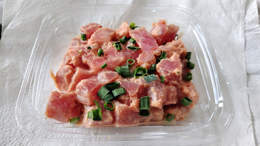 <<お奨め店舗>> ◆Aloha Suites Waikiki徒歩約⑮分にある『Waikiki Market(2380 Kūhiō Ave. 2nd Floor, Honolulu, HI 96815 United States of America・営業時間:0600〜2200)』で毎朝10:30頃から販売している『ginger taste deep fried chicken(sight & starch) upon Julianne cut dried seaweed』は、『無料で unagi sauce や teriyaki sauce 及び 小口切りgreen onion & white sesame & ground<powderd> fried garlic 等が topping 可能』な上に、お手頃価格【▲US$4.18(約▲627円)】で美味しく【◎◎】、ボリュームがあり【約170g<6.0 oz>】特にお奨め【take awayのみ】。
