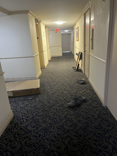 A disheveled and worn out lobby is only the beginning. When we arrived in our rooms there were a myriad of unidentifiable stains and rips on curtains that should be replaced, the mini fridge shelving cracked to the point of unusability, the closet door off tracks, and worst of all, an extremely poor cleaning job upon check-in. I found dried up bugs, cakes of dust, even a clipped fingernail, all within easy sight. All lend itself to a property that is not being maintained.