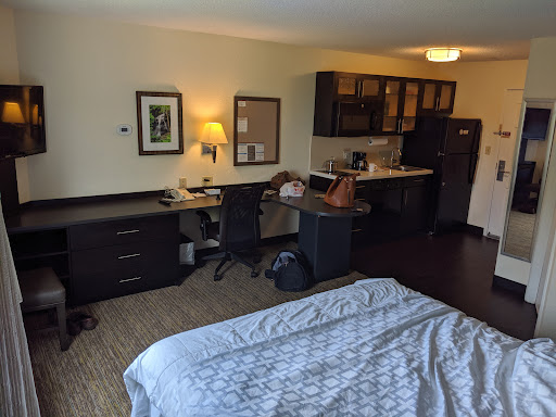 It is so quiet here. I've stayed in another Candlewood property and it was noise upstairs next door downstairs but this visit is off the beaten path as in you can't see it from the highway even though there's more rooms there's three floors and the windows are huge. The rooms are bigger. The bathrooms are bigger. TV leaves a lot to be desired but not enough to take away a star. Wish it had a DVD player in every room. I know I can rent one downstairs but the business area is big. Even my lawyer was impressed at what I was paying for the suite because of how nice and spacious and you have everything you need. If you need anything which I needed some extra padding because of a back surgery and the nice guy that works as the night time desk got me too and I put them underneath the waterproof mattress pad to give me a double pillow top. He also gave me extra pillows to prop my back up on and no one has said a crossword to me or if I get down there at 3:00 a.m. and need a pillow or I accidentally drooled on a pillow and need another case or to change out towels nobody is inconvenienced. Nobody acts like you're bothering them. It's super clean. I stayed in here while housekeeping cleaned my room and she was a doll and did such a great job. My sink was shiny when she left. Everything smells clean the water gets plenty hot the stove works great and the microwave is gigantic. It's updated I've never heard one that didn't just go beep beep beep. This one has a little melody which kind of freaked me out the first time cuz I was in the bathroom and I didn't know where the sounds coming from. Now with all the pillows all I want to do is sleep. I'll be having to spend Christmas here which wouldn't be my first choice but you do what you have to do when you're going through a divorce. I give it all the stars. I'm at the GM and she is very very personable. She took time out of her busy paperwork to come and talk to me. when I got to my room I had a red star on my door showing that I was a spire elite member which means basically I've spent a lot of money. But, they have the cutest signs for the door one of them says catching some z's quiet please I just leave it on there all the time. Cuz I sleep every minute that I can. It's like they're pumping narcolepsy into my room. Lol. It's just nice and quiet and there's not much else I can say other than I don't have to worry if I can get laundry done because there's plenty of machines and dryers. If I need a sewing kit at 4:00 a.m. I can go to the pantry and buy one and have it charged to my room You just fill out a piece of paper with your room number date how much it was what you got and sign your name and slip it in a slot or just slip the cash in the slot. It is on the truth system where no one is standing there you just do the right thing. I've been here a week and this is the best hotel that I've...