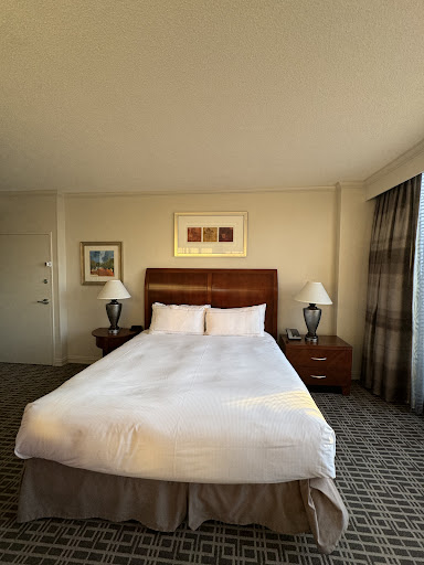 Pay by the day to park in their garage seems expensive, but no other option available for this area unless you want to risk getting towed or theft, plus the inconvenience of walking from your illegally parked vehicle to the hotel. Good experience at check in; nice furniture in the lobby area for waiting to meet up with someone; there's a cocktail lounge that has a couple of televisions showing sports programming, a restaurant, coffee shop that includes breakfast and afternoon sandwiches, fruit, yogurt, packaged snacks and some convenience store items. We purchased a breakfast burrito, bacon with chicken salad sandwich, and Starbucks lattè which were each very good. The Accessible King room was nicely appointed. The bed and linens were very comfortable, but the easy chair lacked lumbar support. The HDTV size was okay, but would've been better if the next size up. It was nice that the TV swiveled. The channel package was provided by DirectTV for hotels, so most of the features of the "at home" version were not included. The bathroom was spacious, but not much room on the counter. A shelf on either side of the sink would have been convenient. The shower was properly equipped for a person with mobility challenges, as well as for others. As usual with these "accessible showers", the shower curtain was too short, allowing plenty of water to flow onto the bathroom floor. We anticipate that condition and don't put down the floor towel until after the shower, which brings me to the towel bars/towel shelf. The unit is located just above the toilet tank (for wheelchair user access, I reckon. Close bowl lid when flushing!) and a bar on the wall in front of the toilet (far enough to miss toilet splatter). The issue is, in this room, the towel bars are about seven feet from the shower. The grout of the shower floor showed age and possibly stains in some places. We observed two very long strands of hair in the bathroom floor and one between the bed and nightstand. Speaking of nightstands, one includes an alarm clock w/radio and a lamp with AC power outlet. The other has the same style lamp. The environmental controller/thermostat in the AUTO setting didn't seem to work properly, as I woke up at least three times to change the setting - started at 72°, then to 70°, then to 68°. At home, on the opposite side of Houston, we set it on 74° for sleeping. Additionally, the vent is located about three or so feet higher than the head of the bed on the wall that's about four feet from one side of the bed. The metal vent fins were individually adjustable, so I adjusted most of them from the downward position to an upward one, cuz, you know, cold air falls and warm air rises. Anywho...the fins were quite dusty, so I had to wipe 'em down. The inefficiency of the controller and the dirty fins seem to be typical for hotel rooms; I'm almost to a place where I expect it, but that doesn't mean it's okay. When we checked in, the employee told us that there's a bar (open until 7pm, it was past that time) at the pool and a fitness room. We did not have the opportunity to enjoy either of them since we were attending a seminar the next morning. In summary, this is an okay hotel, located in an area that has many restaurants and shopping opportunities, but they're spread out from one shopping plaza to another. The Galleria shopping mall is nearby, too. This area has plenty of sidewalks, but the humidity levels and temperatures of spring, summer, early fall may not be conducive for too much walking. Of the many times I've visited this part of Houston, I've never seen a cab there. From Monday through Friday during lunch time, between 2ish and 7ish, and on the weekends and Christmas season the surrounding freeways and surface street traffic becomes very congested. Bottom line, we only stayed overnight at this hotel because we wanted to avoid the inconvenience of an early wakeup on Saturday morning for on time arrival at our 9 a.m. seminar in one of the...