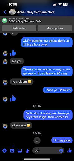 Read moreThese people are scammers I was on Facebook and this lady name ANNA! said she had this couch for sale she made it look like it was hers in a storage unit and I was going to look at it she had it listed for $300 so I told her I was driving a hour and 30 mins away she said she’ll meet me so when I got there she told me go in the store I said what store being that they’re is a storage unit right next door I figured it was the storage unit she quickly then said no moda furniture when I walked next door she messaged me and said ask them about the $300 couch they’re were 3 people that worked there and no one was inside I asked they guy where is the couch for $300 and he said we don’t have it we don’t have used then he asked me who sent me I said Anna !! He said of she works from home but let me sale you a new couch for $1500!!!! I said I see what yall did yall getting people in telling them yall have yall own furniture for sale and then sending them to a storage unit but making them walk next door to try and finance them!! She made me drive 1 hour and 30 mins with my baby for no reason he kept telling me but a new couch and let’s finance it come on like all then was in on it and then I seen another lady asking for the same couch two mins later and she walked out mad as well cause they lied