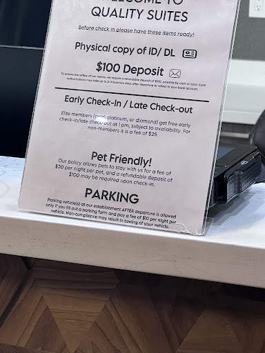 Read moreI moved here with the expectation to start a new life. Everything that could happen to me happened, in such a brief period of time. I was living a true horror story with suspense, biting your nails moments, and sitting on the edge of your seat experiences. I travelled from Buffalo, NY with a well thought out plan. Everything about my plan failed, and my furbabies (who are also registered support babies), and I became homeless. NO money, no car, and no shelter. I had depleted all of my funds, my car broke down on the I10W, 23 miles from my final destination. Low and behold the transmission went on the vehicle. There was nothing I could do to fix it. I had not, that kind of money. My family put me up in a hotel while we figured out my next move. Ricky and Sapna were very empathetic and accommodating to my situation. trying to accomplish a dream, that turned into a nightmare. They extended nothing but kindness, care and concern. My room was clean. The hospitality from all the staff members was great. I felt comfortable, safe, and secure while I figured out my next move. I have nothing but good things to say about this hotel. As long as you do your part, they will do theirs. I'm so eternally grateful for the kindness they shown me during my 10 days stay. If I had to do it all over again, I'd choose this hotel. My family member chose this location, and I truly believe the decision to put me here was a guided decision by God. God knew what was going on, and He provided what I needed through Quality Suites. If I could give my stay here 10 star I would have. Thank you so much for while I was enduring my damsel in distress moment, you Ricky and Sapna stepped right and provide me peace and comfort. You two were my guardian angels who came to my rescue.... If you're reading this, you would want to stay here. Not to mention the prices were very reasonable. Let me get to making my next reservation in case I want to come back. Peace and many blessings to your entire staff.